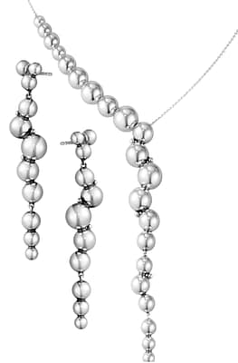 Smyckekollektionen Moonlight Grapes från George Jensen kan beskrivas med två ord: Vill bära! De skulpturalt eleganta – och lekfulla – skönheterna minner också om svunna tider. Inspirationen kommer från den vackra fruktskålen i silver med nedhängande druvor i art noveau-stil (eller jugend som vi säger i Sverige), som George Jensen skapade 1920 och som blev vida berömd. Det anrika danska designhuset har en förtrollande förmåga att skapa en modern twist av sina ikoniska mönster – samtidigt som de aldrig gör avkall på sitt designarv. Pris för örhängen 3 700 kr, halsband 6 250 kr. Smyckena finns även med guld och med diamanter
