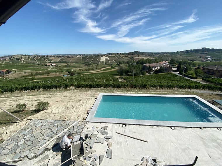 I februari, som ni kunde läsa i inlägg 5 berättade jag om vår plan för poolen. Den första april togs första spadtagen för grävning. I maj var all gjutning av betong på plats. I juni monterades stenkanten runt poolen. Poolsystem, rening, lampor och annan tekniken sattes på plats. I början på juli lades poolduken på plats.