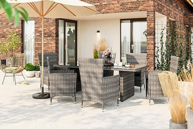 Äkta rottingmöbler är gjorda av fiber från en palm och ska stå skyddade därför passar de bäst i ett uterum eftersom de inte tål fukt. Samma sak gäller för möbler av bambu. Väljer du möbler i konstrotting spelar det ingen roll, de klarar att bli våta. Konstrotting tillverkas av konstfiber som flätas samman. Materialet är slitstarkt, väderbeständigt och enkelt att rengöra. Dynorna är det förstås bra att ta undan innan regnet kommer. En dynlåda i samma material är praktisk och snygg, det går snabbt att lägga alla textilier från stolar och soffor i den, så placera den inom räckhåll på altanen eller på uteplatsen.